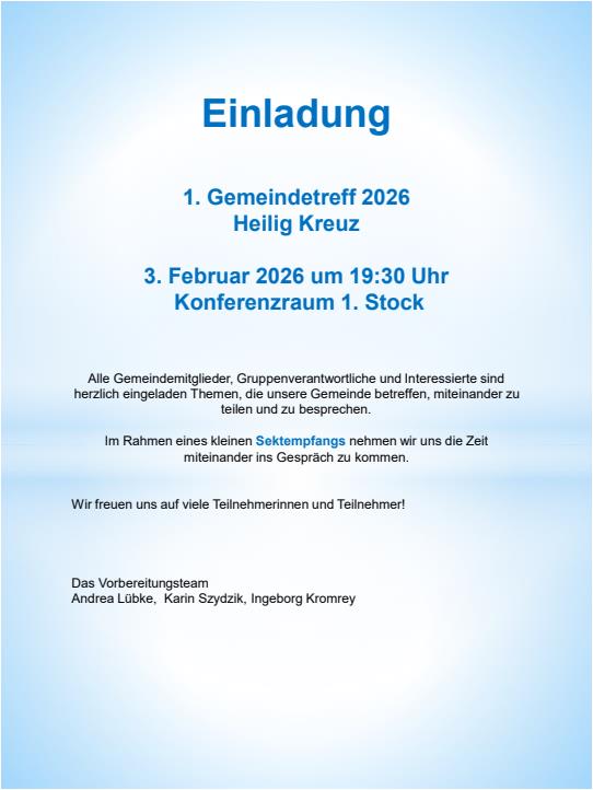 Einladung zum 1. Gemeindetreff 2026 in Hl. Kreuz am 03.02.26 um 19:30