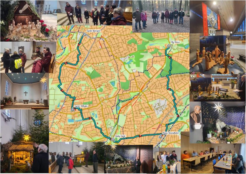 14 Pilger aus allen Gemeinden sammelten sich am 18.1. in Sankt Bernard vor der Krippe und wanderten fast 20km durch Parks und kleine Straßen. Es war erstaunlich welchen unterschiedlichen Charakter und Geschichten die Krippen haben, die uns jeweils liebevoll erklärt wurden. In St. Wilhelm wurden wir herzlich in den Neujahrsempfang aufgenommen, in Maria Himmelfahrt zu einer Mittagspause unerwartet reichlich bewirtet. Durch das Miteinander, intensive Gespräche, die sich beim Pilgern mühelos ergaben, das gute Wetter und den Abschluss mit der Abendmesse in Hl. Kreuz in Volksdorf waren wir am Ende des Tages alle mit einer spirituellen Erfahrung beschenkt, müde und zufrieden. Danke an alle, die dies möglich gemacht haben!