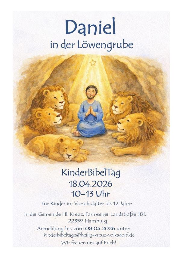 Einladung zum nächsten Kinderbibeltag am Samstag, 18.04.26 von 10 – 13 Uhr in Hl. Kreuz – Volksdorf 16. März 2026 luebke Hinweise zur Anmeldung und den Flyer zum Ausdrucken und Weiterreichen finden Sie hier!