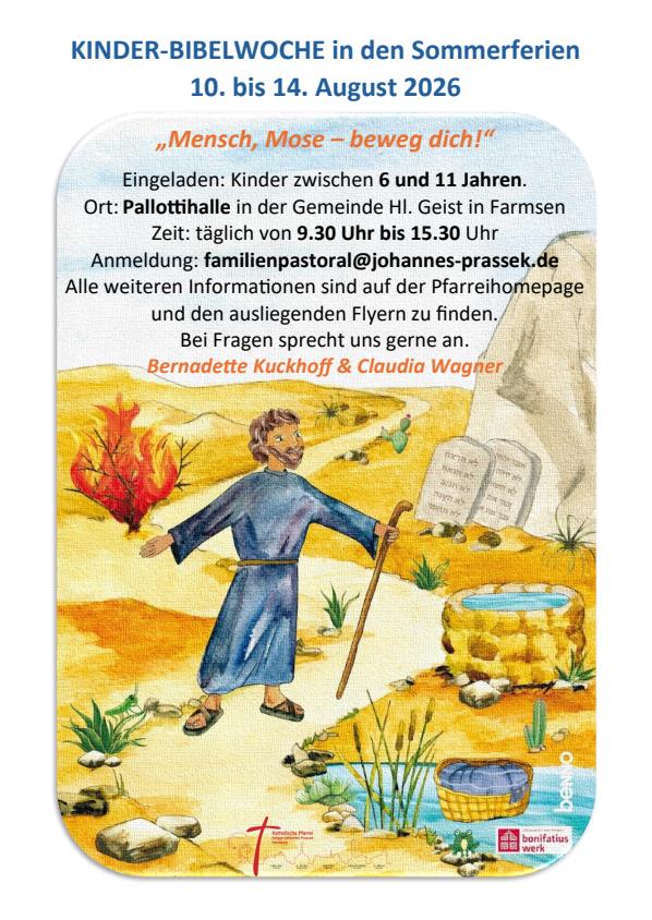 Anmeldehinweis für die Kinderbibelwoche in den Sommerferien 10.-14.08.26 in Hl. Geist – Farmsen 27. April 2026 luebke Nähere Informationen zur KiBiWo und der Anmeldung finden Sie im Flyer hier!