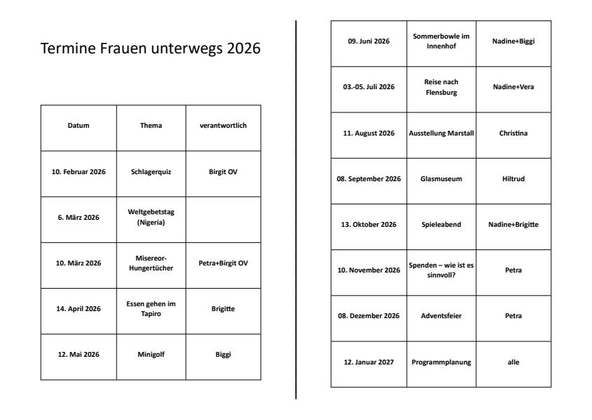 „Frauen unterwegs“ ist eine Gruppe von Frauen, die sich einmal monatlich – in der Regel um 19:00 Uhr in den Gemeinderäumen – zu den unterschiedlichsten Themen und Aktivitäten treffen. Wir feiern miteinander, bilden uns fort, hören Vorträge, reisen und erkunden interessante Orte in und um Hamburg. Wir sind kfd-Gruppe und offener Kreis zugleich und freuen uns über jede Frau, die an unseren Veranstaltungen teilnimmt.