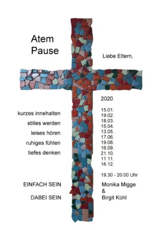 Wir setzen das neue Format „Atempause“ nach der Corona-Pause fort. Einmal im Monat Mittwochs von 19.30 Uhr -20.00 Uhr, möchten wir für eine halbe Stunde innehalten, still werden, Gott und uns selber vielleicht auf eine andere Weise wahrnehmen…….
