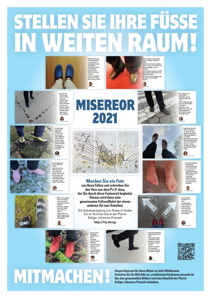 Schicken Sie ein Bild von Ihren Füßen – mit oder ohne Schuhe – in weitem Raum, per Mail an Frau Weldemann. Sie sammelt die Bilder, die dann (ohne namentliche Nennung) zum Osterbild unserer Pfarrei in diesem Jahr werden sollen. Einsendeschluss für die Bilder ist der 21. März 2021. Lassen Sie sich vom Plakat inspirieren und machen Sie mit! Bleiben Sie gesund und behütet! Ihr Pastoralteam