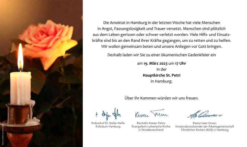 Einladung zur Gedenkfeier am 19.03.23 für die Opfer der Amoktat in Hamburg