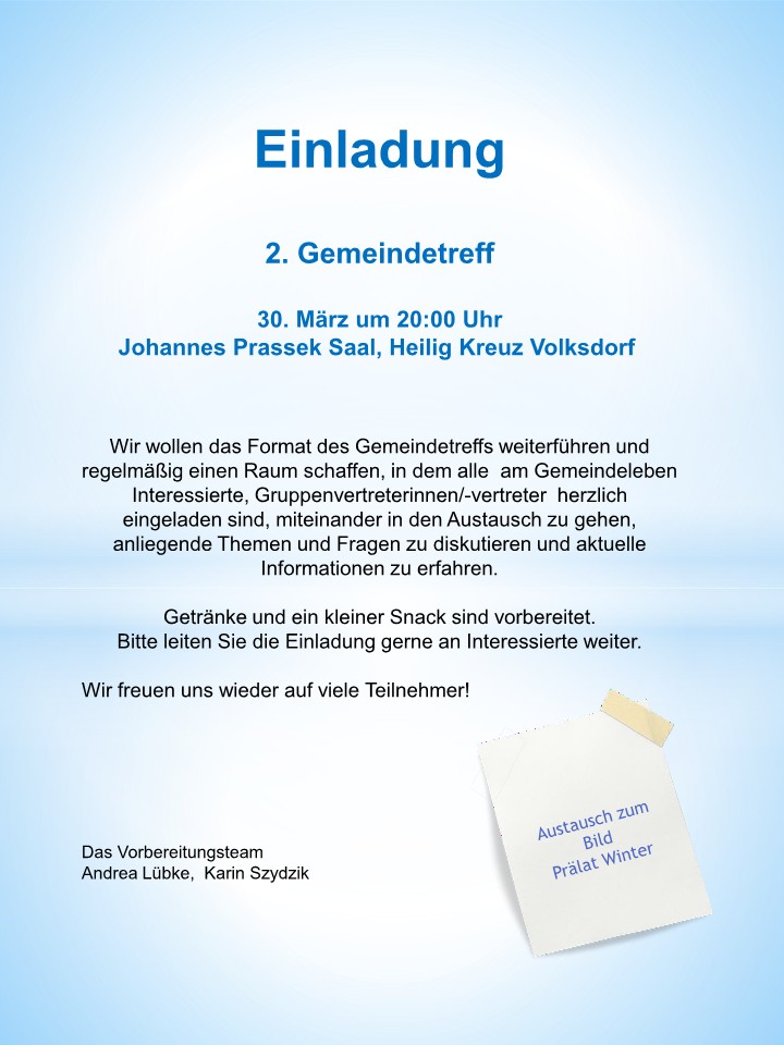 anliegend findet Ihr / finden Sie die Einladung zum 2. Gemeindetreff am 30.03 um 20:00 Uhr im Johannes-Prassek-Saal.