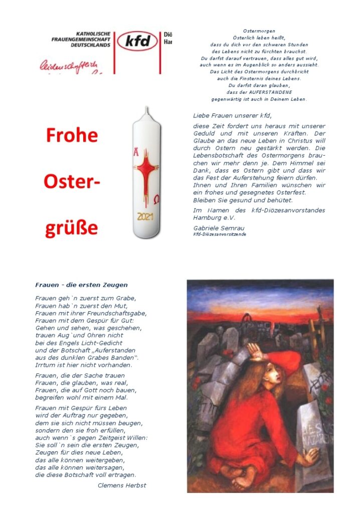 Die Katholische Frauengemeinschaft Deutschlands (kurz kfd) ist der größte Frauenverband Deutschlands (siehe auch: www.kfd.de). Im Erzbistum Hamburg wurde der Verband 1995 als Diözesanverband e.V. mit mehr als 900 Mitgliedern gegründet.